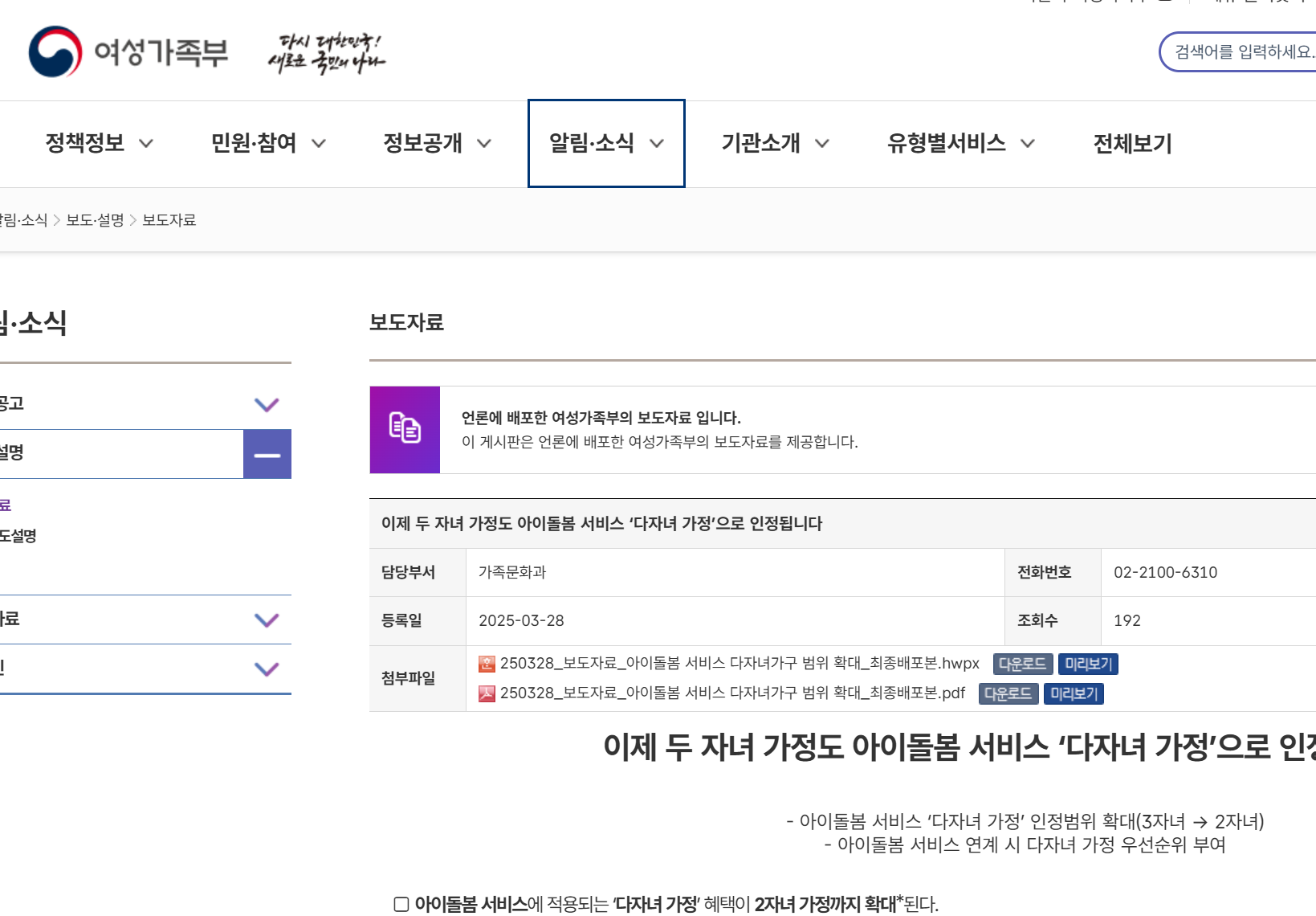 여성가족부는 개정된 「아이돌봄 지원법 시행규칙」을 통해 2025년 3월 31일부터 자녀 수 기준을 완화했다고 밝혔어요.